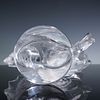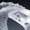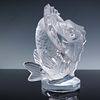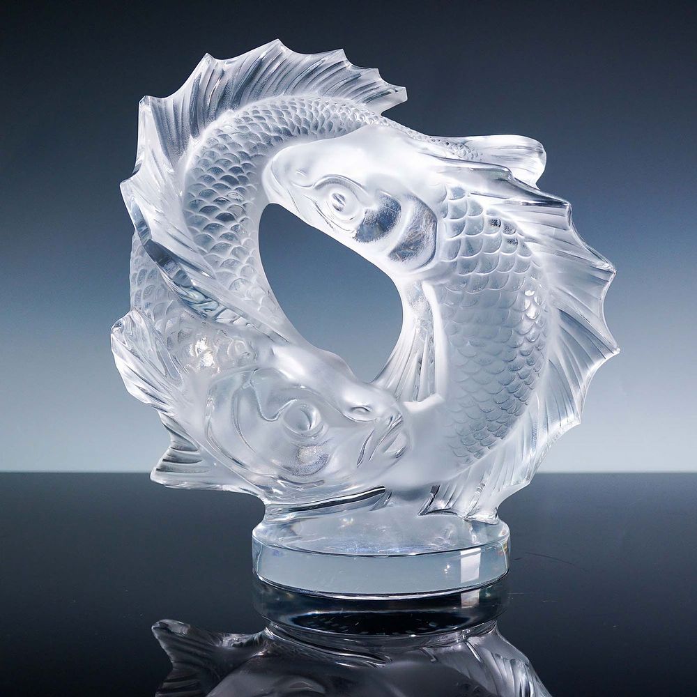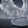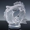 Originally designed in 1953 by Marc Lalique. This large decorative crystal piece depicts two koi fish arranged in a circular formation, their forms rising together as if breaching water. Executed in satin-finished and polished crystal, the sculpture demonstrates detailed rendering of the scales, fins, and facial features, highlighting the contrast between frosted and clear textures. The piece is mounted on a round integrated base and bears the Lalique France etched signature on the underside. The dimensions are approximate.