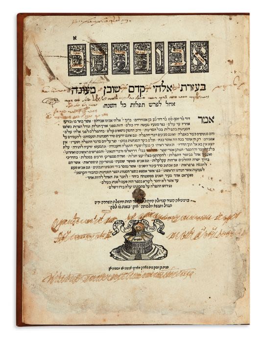 Letters of title historiated. Printer’s device on title (Yaari, Hebrew Printer’s Marks 16). Printed in double columns. Wider margins. Marginal notations. Title-page with previous owner’s notations including one by “Luzzatto of Asti.” Censored in places with officiating signatures at end, including one by Boniforte del Asinari in both Latin and Hebrew.